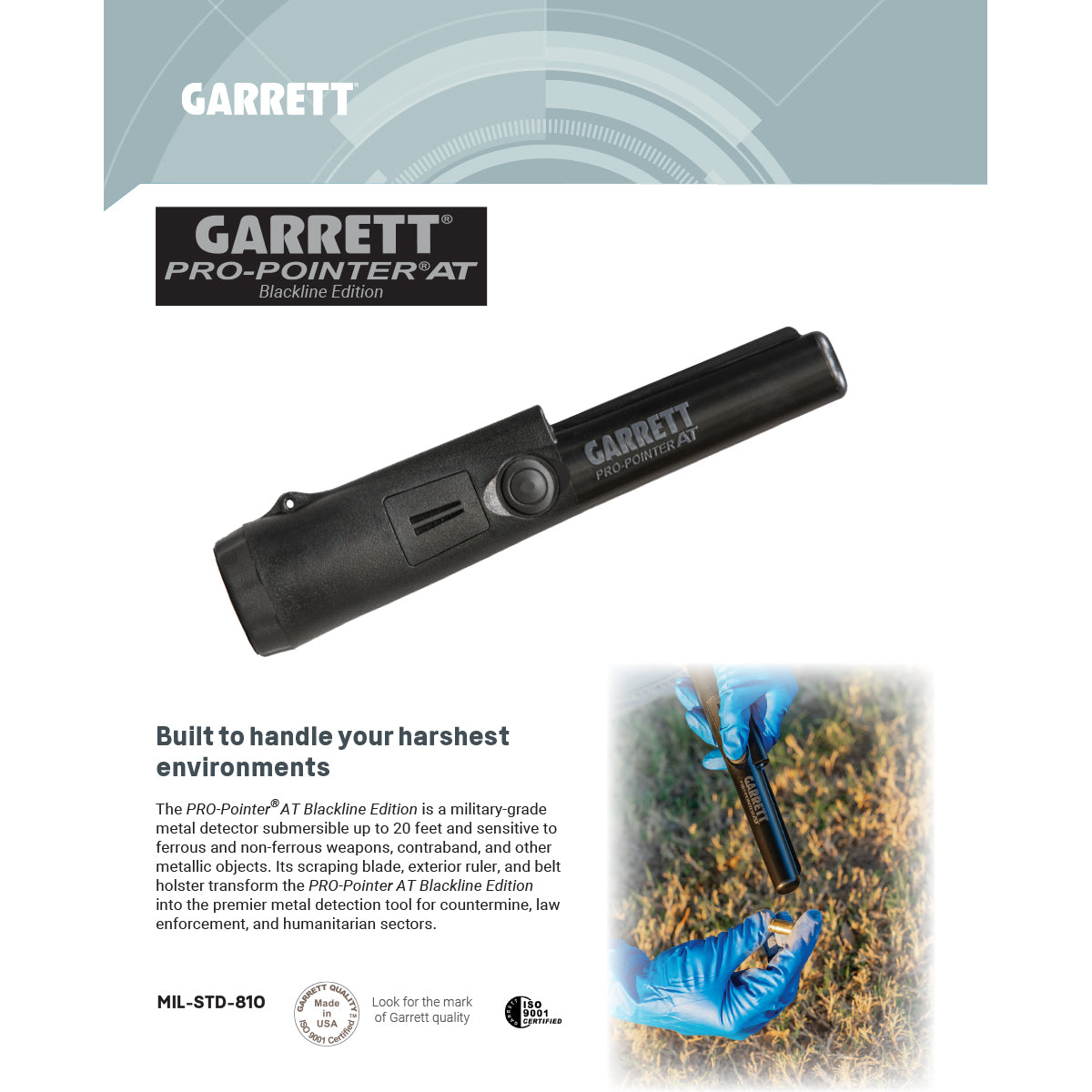The PRO-Pointer® AT Blackline Edition is a military-grade metal detector submersible up to 6 metres and sensitive to ferrous and non-ferrous weapons, contraband, and other metallic objects. Its scraping blade, exterior ruler, and belt holster transform the PRO-Pointer AT Blackline Edition into the premier metal detection tool for countermine, law enforcement, and humanitarian sectors.