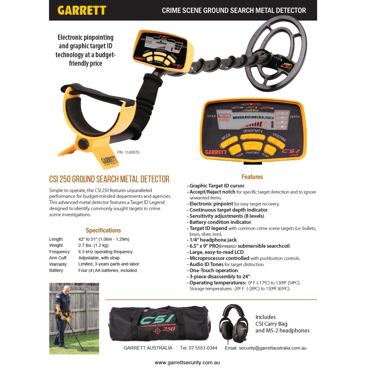 Regular price AUD $419.40Simple to operate, the CSI 250 features unparalleled performance for budget-minded departments and agencies. This advanced metal detector features a Target ID Legend designed to identify commonly sought metallic targets in Crime Scene Investigations.