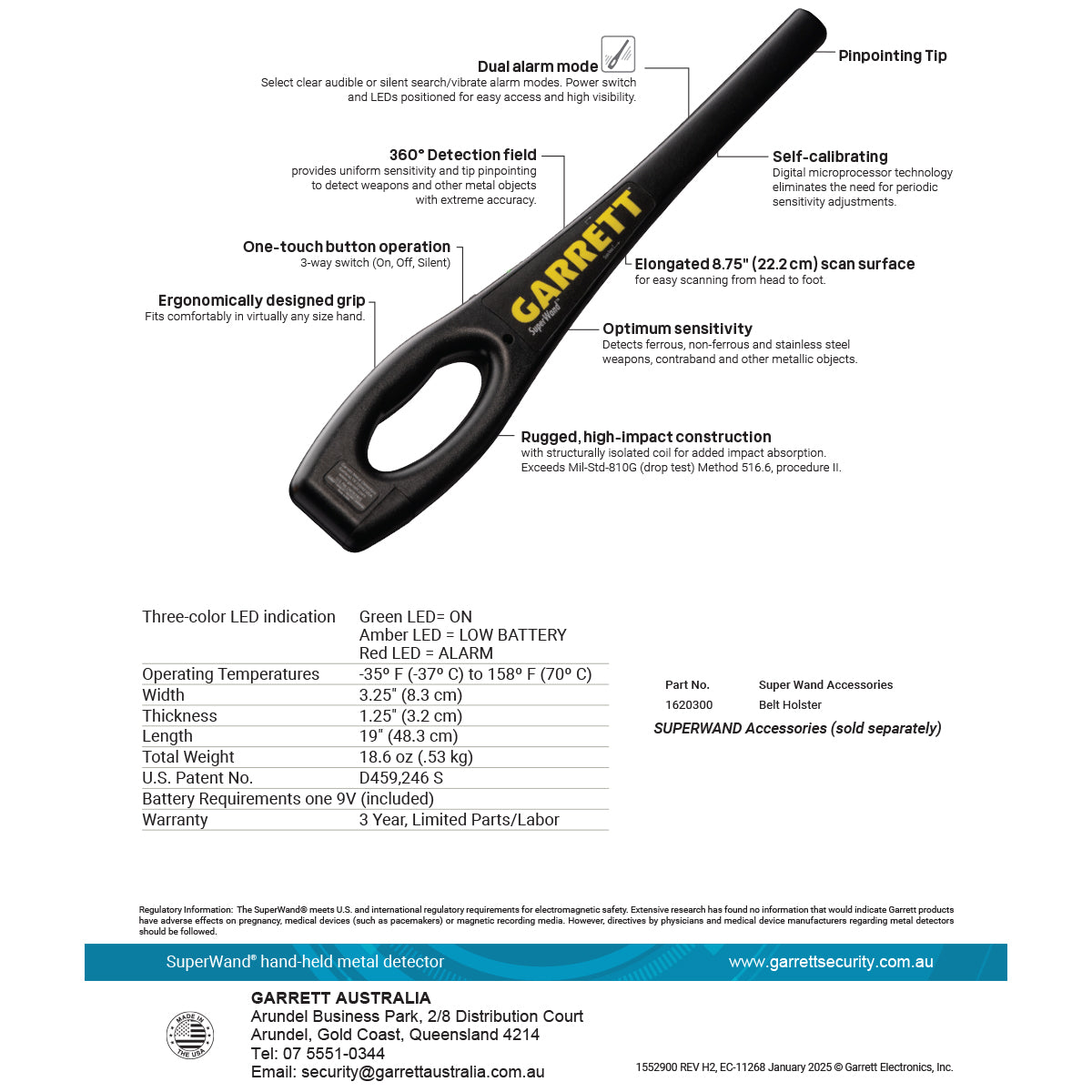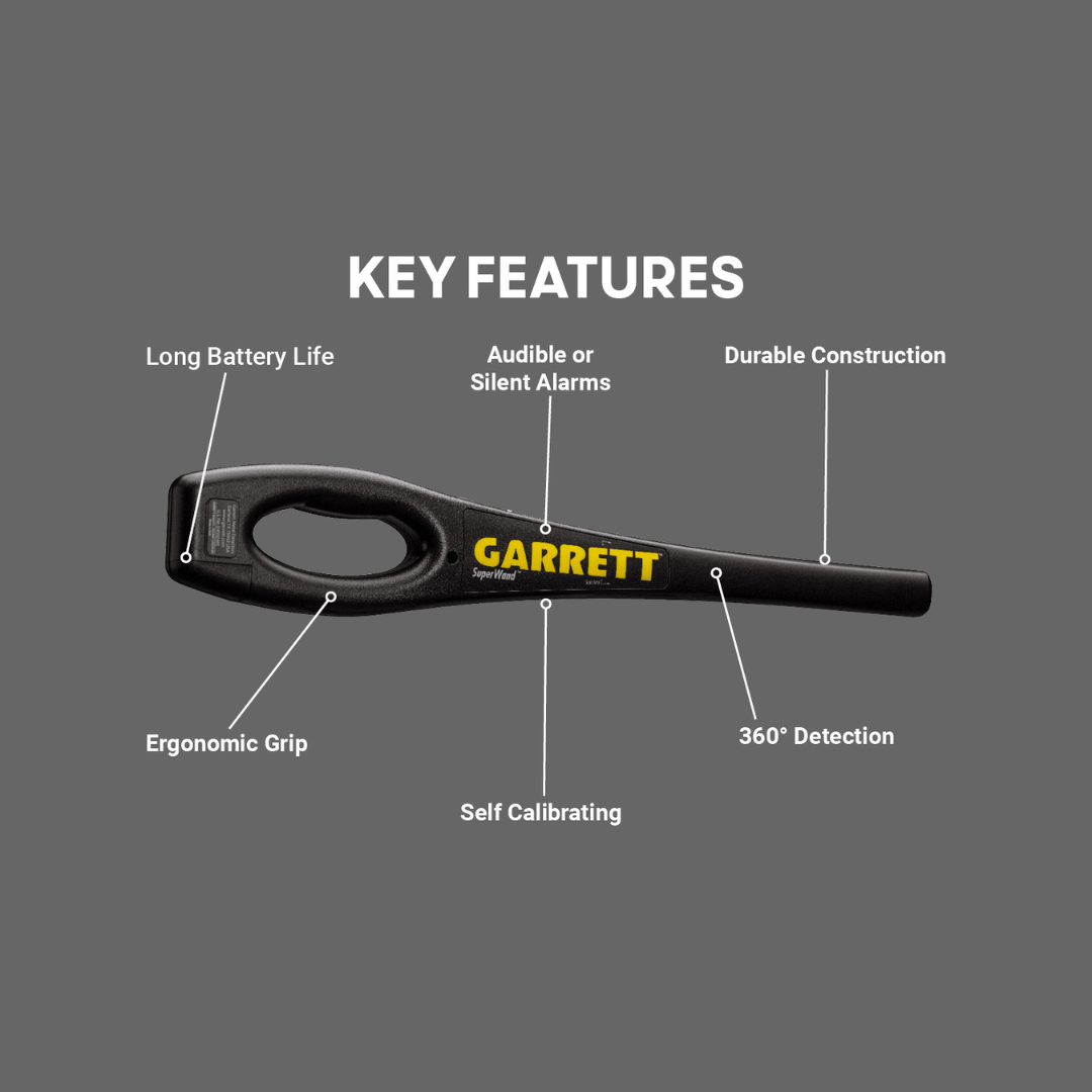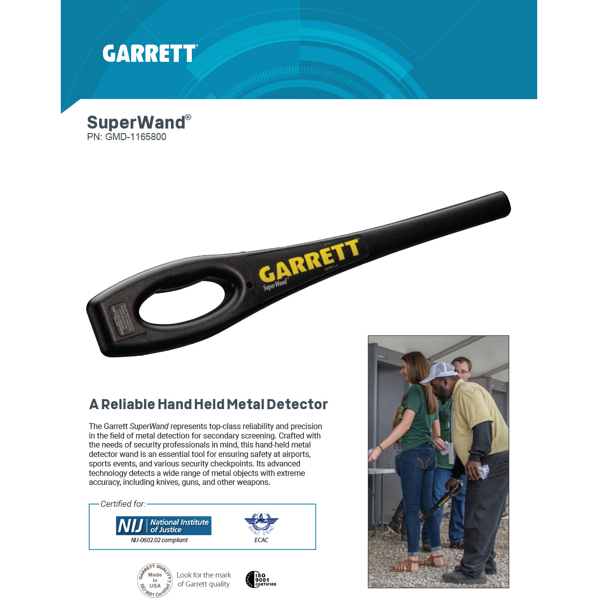 The Garrett SuperWand represents high reliability and precision in metal detection for secondary screening. Designed with the needs of security professionals and law enforcement in mind, this hand-held metal detector wand is an essential tool for ensuring safety at airports and other security checkpoints.